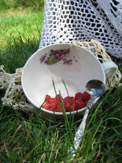 all summer long. Mother had given them an old table and two chairs for the patio, so they could have tea on sunny days. They would make cucumber sandwiches, cutting the slices of bread into shapes with the cookie cutters. It was fun to smooth on the cream cheese and top them with thin, salty cucumber slices. When you bit into them, they made a tiny crunch and filled your mouth with cold, salty goodness. They would have a bowl with berries, sprinkled with sugar. Sometimes strawberries, sometimes rasberries, blueberries in August. They liked rasberry tea, with milk and maple syrup, stirring it with the old silvery spoons from Mothers drawer.